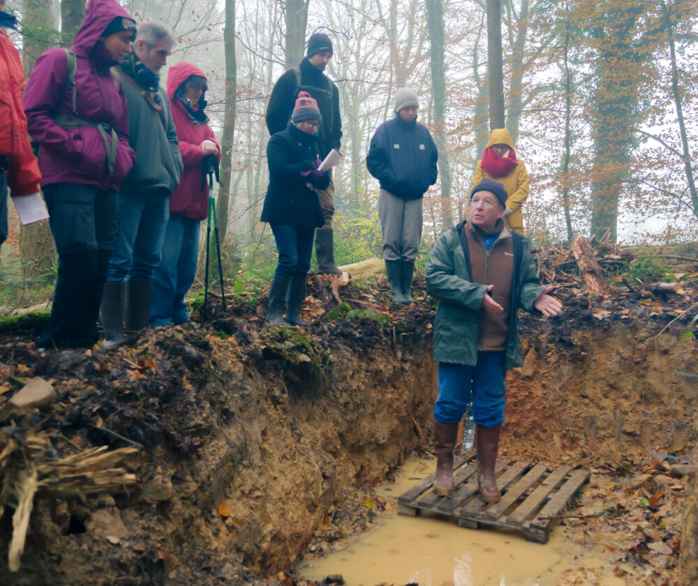 Cette sortie terrain est organisée dans le cadre du projet IPRSols qui vise à former une communauté de référents sur la qualité des sols forestiers à l’échelle nationale. Le rôle de référent est de pouvoir aiguiller les propriétaires et gestionnaires forestiers pour mieux prendre en compte les sols dans la gestion de leurs forêts.
