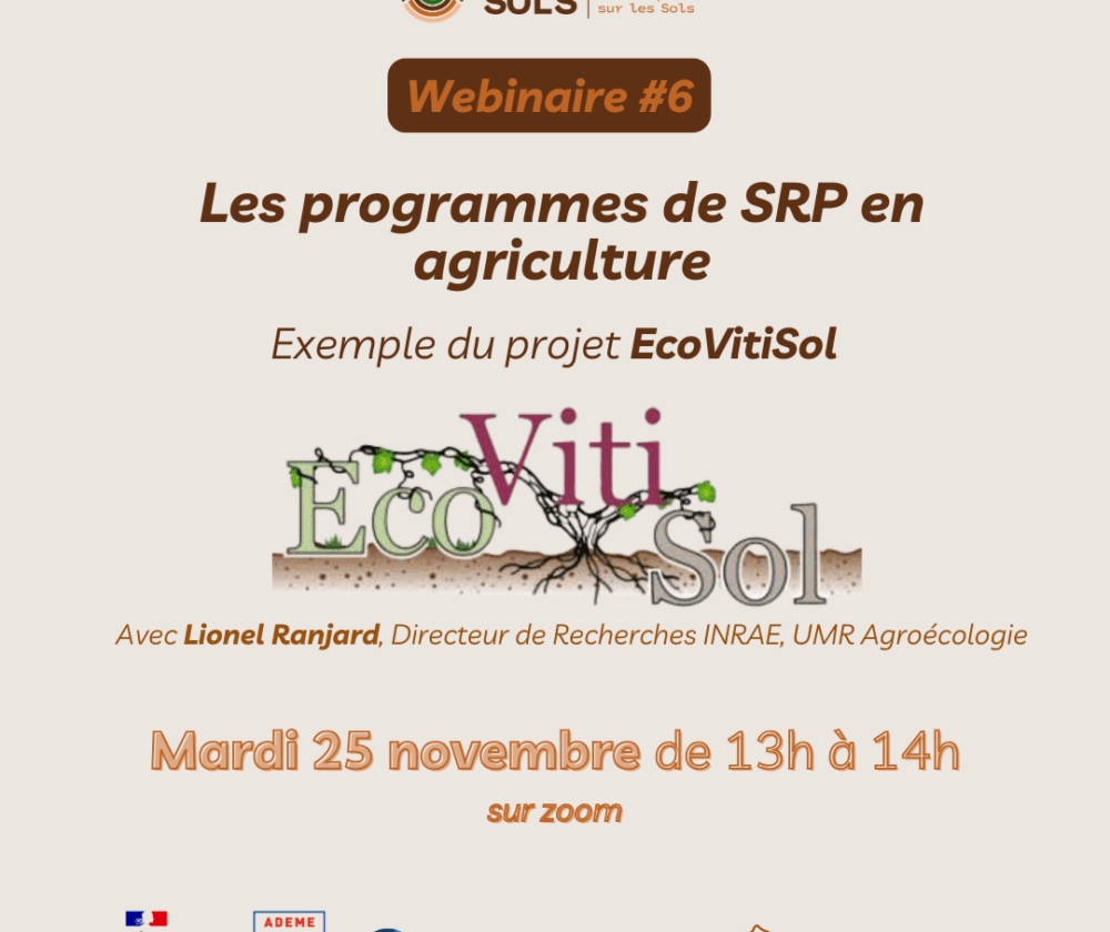Sixième webinaire Sciences et recherches participatives sur les Sols, ouvert à tous « Les programmes de SRP en agriculture. Exemple du projet EcoVitiSol » avec Lionel Ranjard, Directeur de Recherches INRAE, UMR Agroécologie.